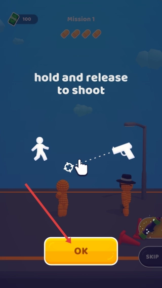在“Mission1”界面点击“OK”按钮进入游戏,随后按照提示长按并松开屏幕来完成蓄力射击操作。