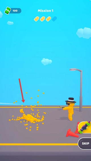 锁定敌人的黄色人偶,发射子弹,借助弹道的反弹效果,精准命中目标以达成击杀。