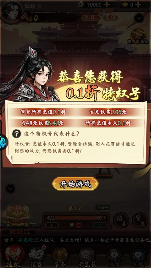 1、登录即赠VIP7、88万元宝、1000万银两与1000充值点。