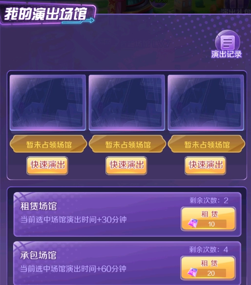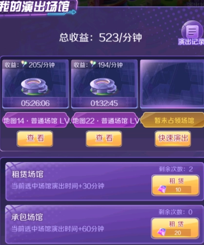 点击“我的演出”就能查看自己占领的场馆,还可以消耗钻石延长在场馆的停留时间,从而获取更多收益哦。