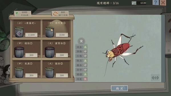 2、蟋蟀图鉴系统内容丰富,随着游戏进程不断解锁新图鉴并升级,能让玩家在比赛中获得更优质的体验。