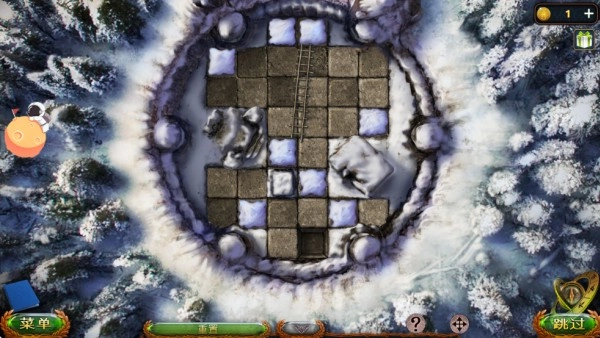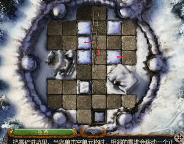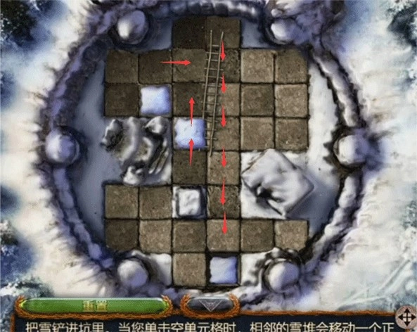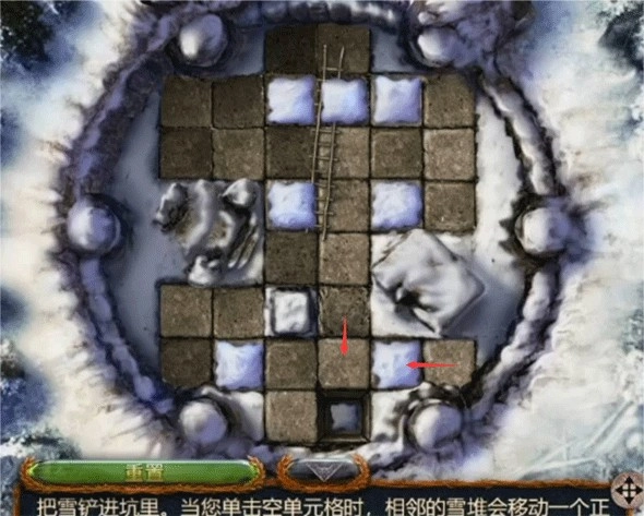 7.先铲右上角雪堆,点击右侧,再点击上方,一路向下点,即可将其铲进坑中,注意,点击过程中会使左上角雪堆左移1格。