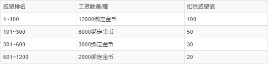 在游戏世界里,所有满足江湖威望要求的玩家,每周都能领取一定数额的绑定金币作为工资。每月领取的绑定金币总价值最高为500元,领取工资的同时会消耗相应的江湖威望,具体的工资标准可参考下图:
