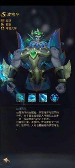波塞冬定位为水系核心,兼具驱散、控制与单体控制能力。其普攻可对直线目标造成伤害,同时附加基于自身攻击力百分比的真实伤害;满级后,若目标生命值低于15%(BOSS除外),将直接触发斩杀效果。CD技能会释放水泡,对范围内敌人造成伤害后,放逐其中攻击力最高的目标(BOSS除外);满级时,该目标在放逐结束后还会受到自身10%最大生命值的伤害。大招为召唤海啸冲击直线敌人,造成伤害的同时随机驱散数个增益状态;满级后,被驱散的目标将暂时无法获得新的增益状态。此外,波塞冬拥有专属光环效果,能提升水系战魂造成的伤害;其羁绊技能则可针对生命值百分比高于50%的单位,进一步提高自身对该类目标的伤害输出。