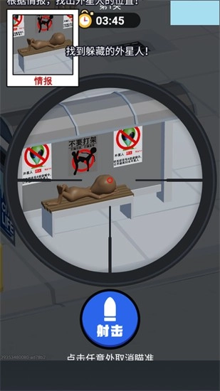 游戏以 “外星人伪装入侵地球” 为背景,玩家扮演地球守护者,在都市街道、太空基地、废弃工厂等 5 大主题场景的 100 + 关卡中,限时搜寻并狙杀伪装目标。主线推进解锁武器 / 道具 / 难度,含 PVP “你狙我躲”、每日挑战、全球排行榜等模式;单局 5-10 分钟,支持离线收益与跨设备同步,通关星级决定金币 / 道具奖励,新手免费领基础狙击枪,高级武器与道具靠关卡奖励解锁。