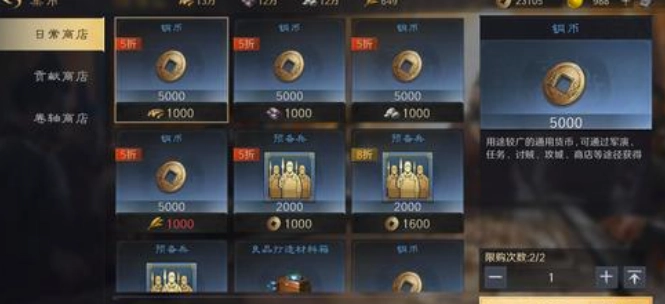 2、点开同盟,会有商店,日常和贡献商店,前期急需铜币升级战法,所以该买的记得买,同时也有预备兵为你翻车保驾护航,预备不够时可进行购买,日常商店每天都会更新,贡献商店7天一更