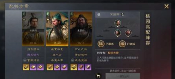 桃园战法不固定,刘备减伤+增伤或回奶战法,张飞控制兵刃战法,关羽兵刃输出即可。