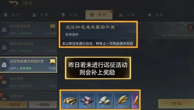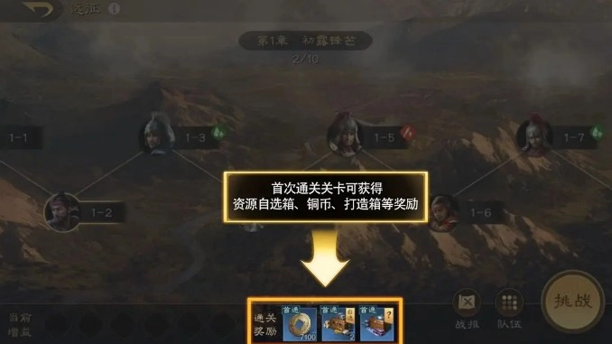 在远征中,首次通关关卡可获得资源自选箱、铜币、打造箱等奖励,重复扫荡关卡获得基础资源奖励。