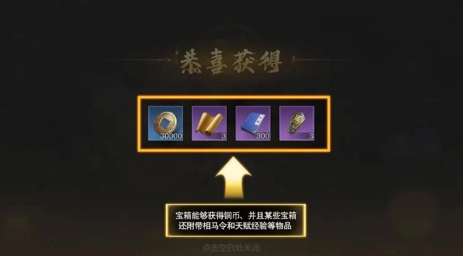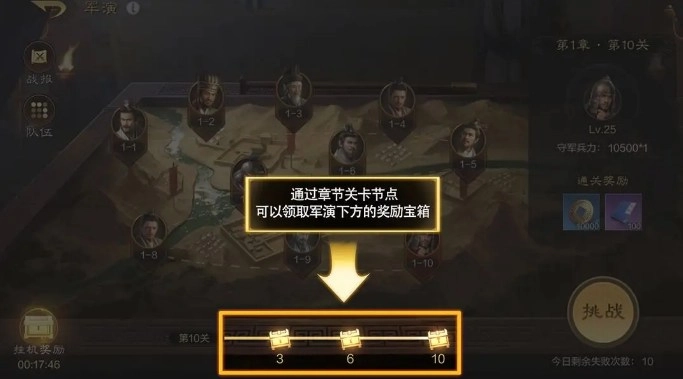 通过章节关卡节点(3、6、10),可以领取军演下方的奖励宝箱,宝箱能够获得铜币、并且某些宝箱还附带相马令和天赋经验等物品。这是前期快速获取铜币的途径,也是获得相马令的好地方。