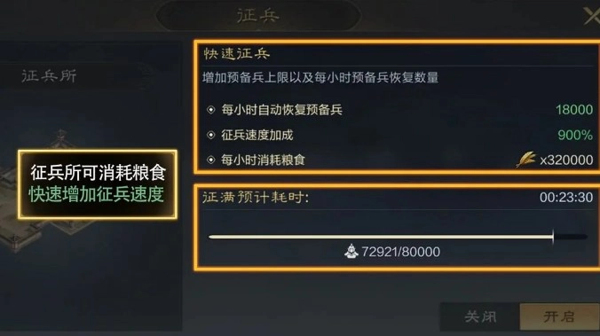 三、粮食作用:粮食主要用在征兵所,同时城外营帐中征兵时,也需消耗粮食。