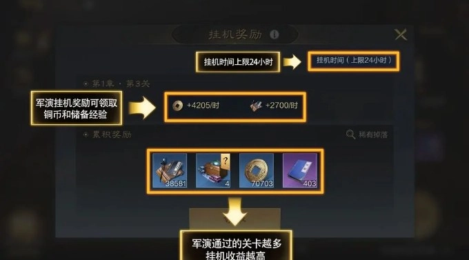 军演左下方可领取挂机奖励,获得储备经验和铜币。军演通过的关卡越多,挂机收益越高,还有几率获得稀有掉落物。但挂机时间上限为24小时。