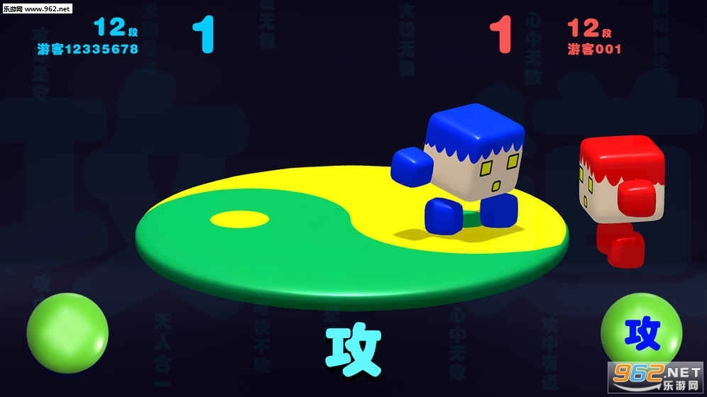 这是一款1V1的对战游戏,玩家通过“攻”和“无”两个按钮来分别执行攻击和闪躲动作。目标是将对手推下太极盘,成功做到即可赢得一局。每场比赛采取三局两胜的赛制。