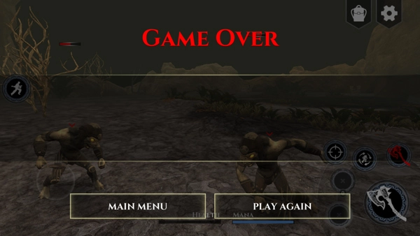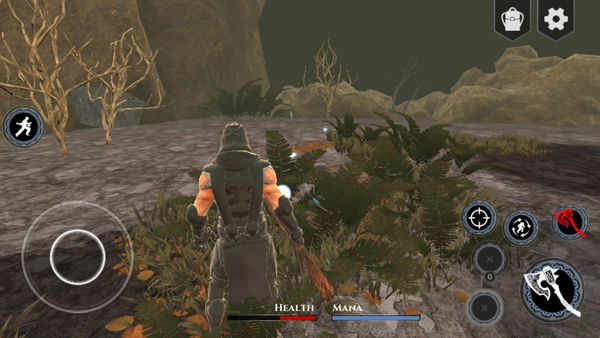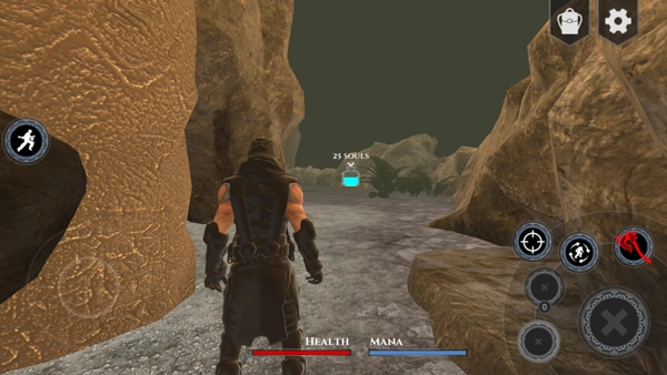 游戏内的界面布局如下:屏幕左侧的按键用于操控角色移动,右侧分布着攻击、闪避、瞄准等功能键位,而角色的血量与蓝量信息则显示在屏幕下方。