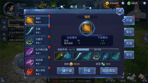选好需要升级的装备后,点击“自动添加”按钮,背包内绿、蓝品质的装备会自动填充到升级材料栏中,最后点击“升级”按钮完成操作。