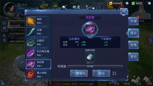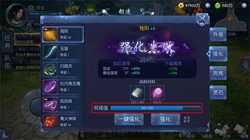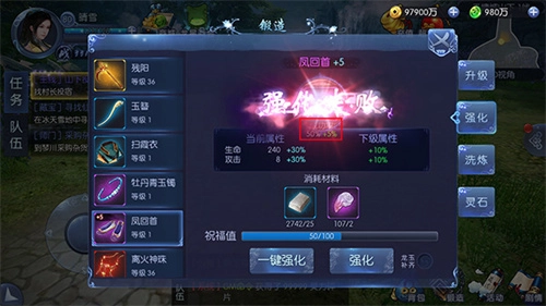 强化失败时祝福值会相应增加,待祝福值累积满额后,当前的强化操作将必定成功!