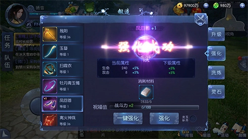 装备强化能够按百分比增加装备的属性数值。和装备升级相比,强化对战斗力的提升效果更为明显。