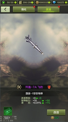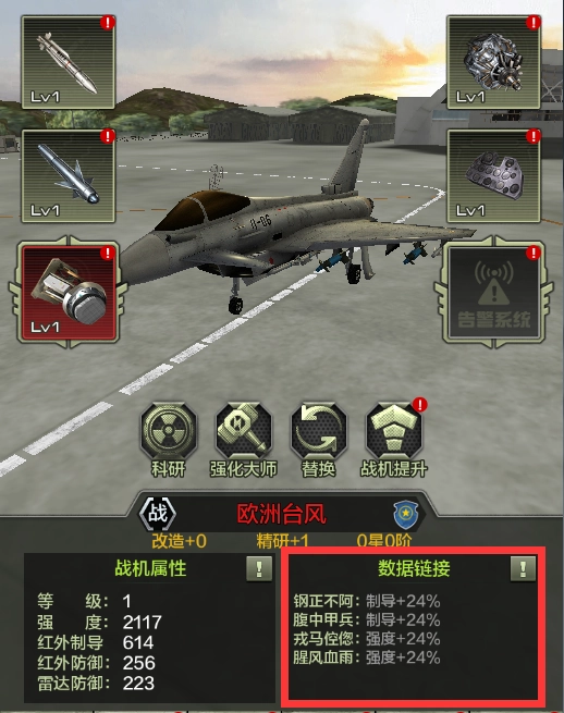 战机初始配备四件自带装备,分别对应制导能力(攻击力)、强度(血量)以及两种防御能力。装备可通过强化增强属性,还能通过改造提升品质。