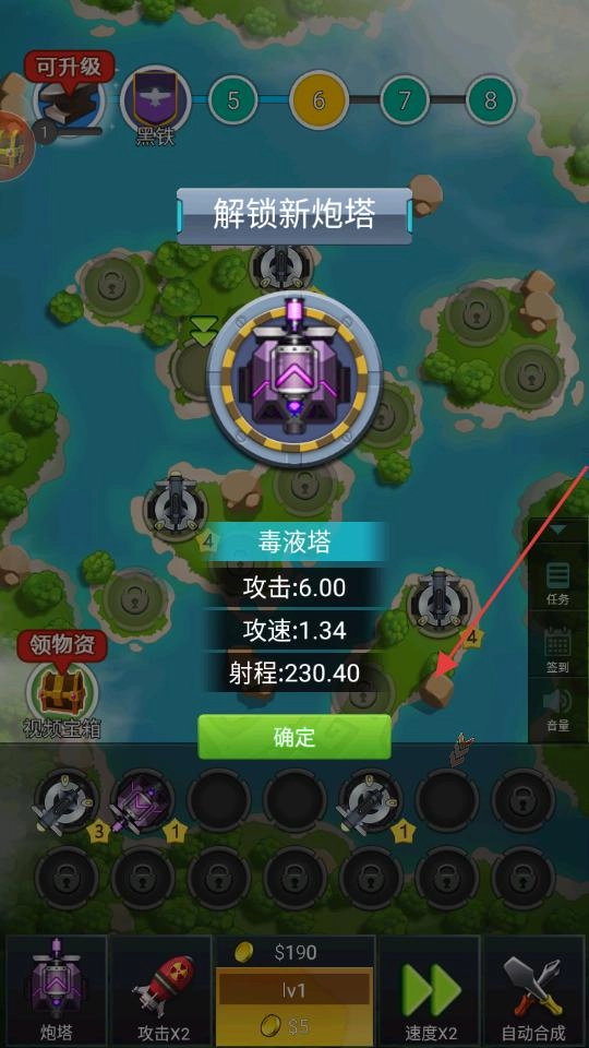 游戏解锁了新的毒液塔,其攻击力为6.00,攻击速度是1.34,射程达230.40,点击确定按钮即可确认解锁。