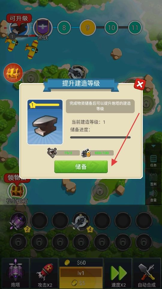 提示提升建造等级,完成物资储备后可提升炮塔建造等级,当前等级1,有储备按钮用于储备。