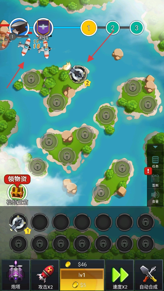 游戏界面呈现为岛屿地图样式,包含敌方飞机的进攻环节、我方炮塔的攻防操作,以及领取物资和开启视频宝箱的功能模块,界面下方还设有炮塔部署、攻击加倍等功能按钮。
