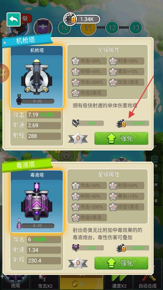 游戏中存在机枪塔与毒液塔这两种炮塔,机枪塔的攻击数值为7.19、射速是2.69、射程达288,毒液塔的攻击为6、射速1.34、射程230.4,并且这两种炮塔均能够进行强化操作。