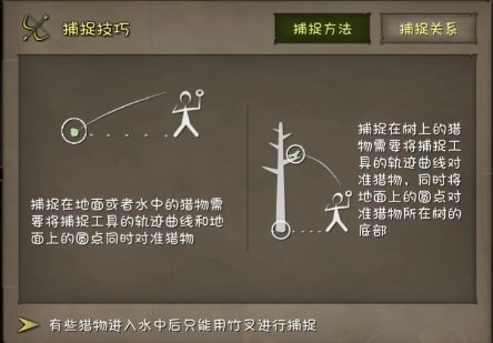 游戏中有不少投掷类工具,石头,竹叉,弓箭。有时候你会碰到一些猎物,如草原上的兔子,池塘里的鱼。你需要用你的投掷工具瞄准猎物进行猎杀,当然不同的猎物需要不同的投掷工具。