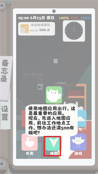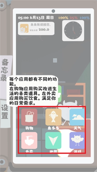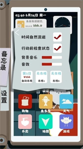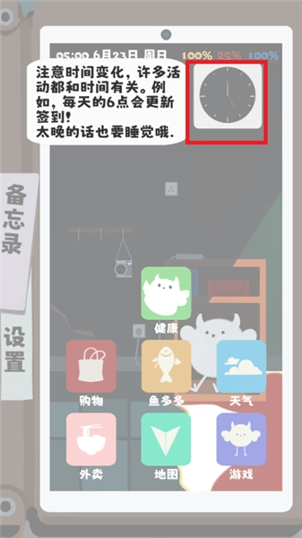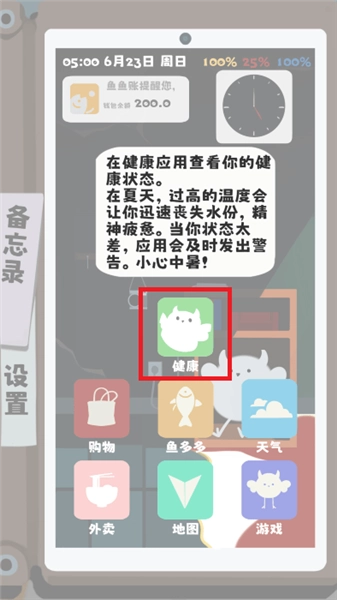 房东的冷漠,烈日的炙烤,让你不得不每天为避暑绞尽脑汁,一心想在夏天结束前,攒够钱买台属于自己的空调。一旦气温飙升,身体脱水的速度会明显加快,精力也会随之下降;要是状态太差,甚至可能昏倒,这时候就得赶紧点外卖补充饮食,好让状态恢复过来。看着银行卡里捉襟见肘的余额,你只能靠在地图上找到夜市摆摊,或是去打工地点做零工来赚钱糊口——每天的行程都得仔细盘算,才能勉强支撑下去。 购物App里能买到改善生活的各种道具,当然也包括游戏的终极目标:空调。要是前期手头实在紧张,还能在鱼多多二手App上,把自己已经拥有的道具转手卖掉换钱。不过在每天做决定之前,可得多留意两件事:一是打开天气App看看当天的天气情况,二是在健康界面查一查自己当前的身体状态,这些信息对你规划行程至关重要。