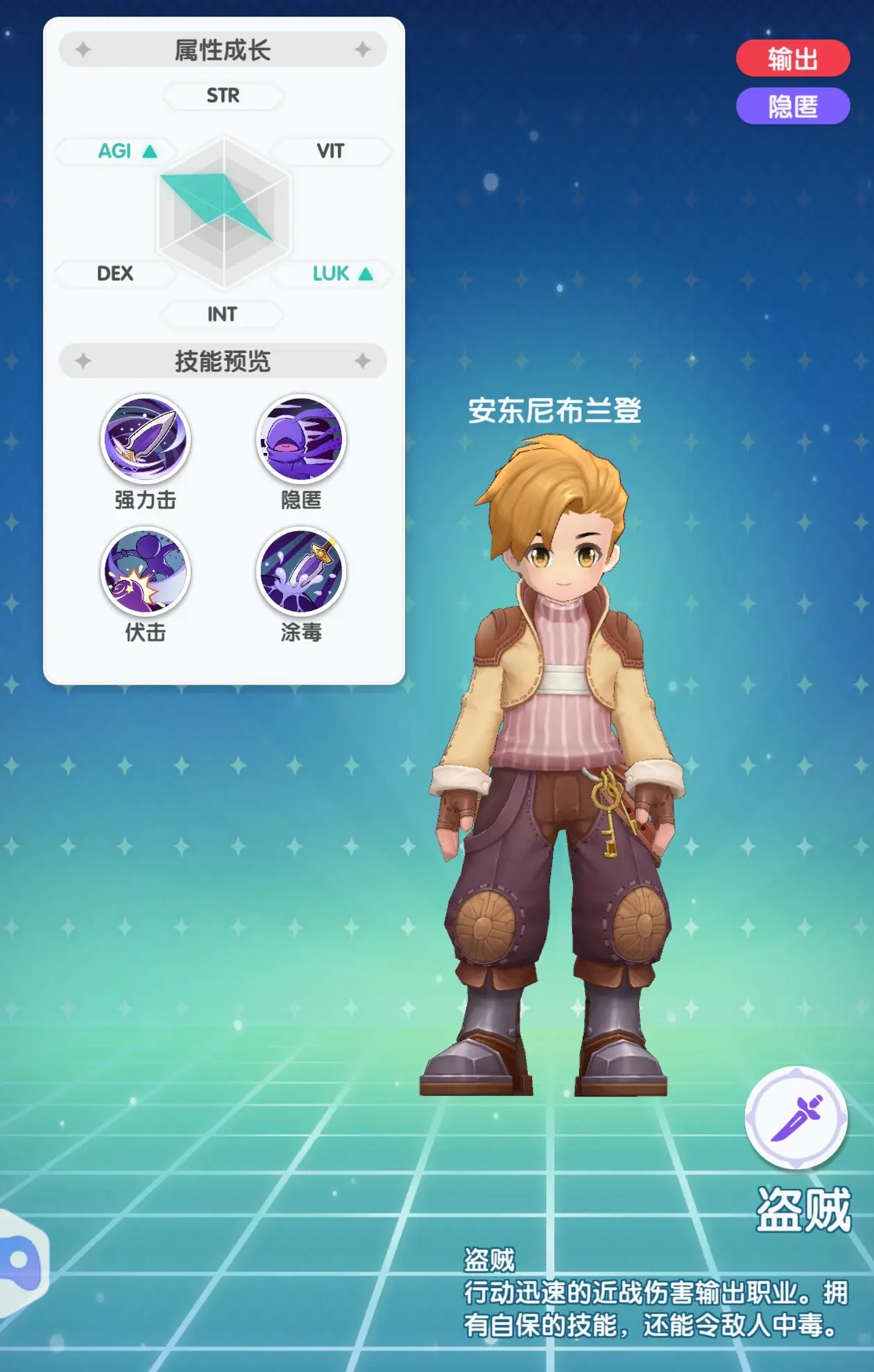 隐刺路线偏向控制路线,二转后可以造成对手属性降低的特效技能