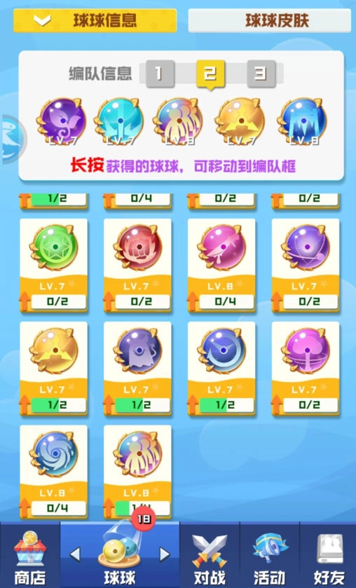 球球的种类十分丰富,每个都有着独特的技能。就算获得了重复的球球也不用发愁,消耗这些重复的球球就能提升球球的等级,助你打造更强大的阵容!