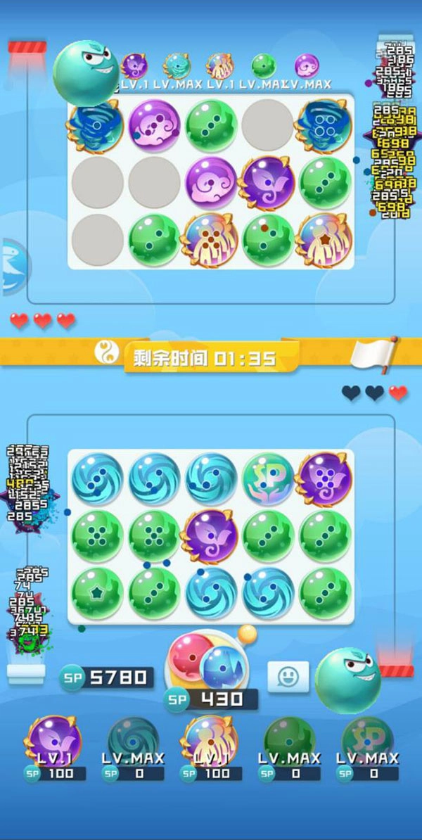 您会随机匹配到另一位玩家,两人分别占据一块场地。其中一方消灭的敌人,会被传送到对手的场地中。双方各有三点生命值,每当敌人突破一次防线,生命值就会减少一点,生命值耗尽时游戏便宣告结束。这场对战紧张又刺激,既考验脑力,也离不开运气!