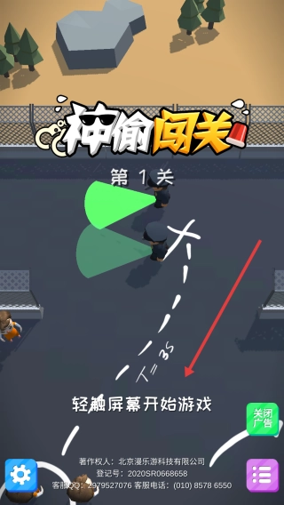 进入第一关,轻触屏幕就能开始游戏,要避开警察的视线范围,规划好移动路线开启闯关。