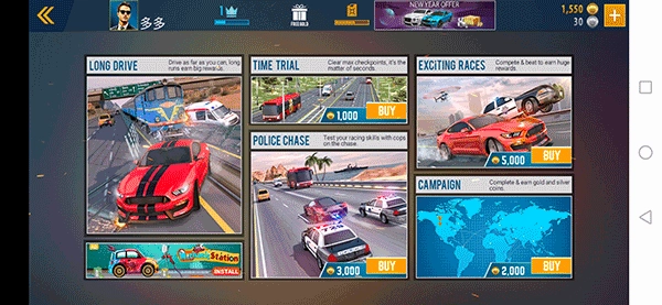 1、提供多种竞赛模式选择,包括普通竞速、计时挑战、警察追捕、速度对决与故事剧情模式。