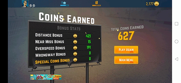 5、不小心失败后可以选择再来一次(play again),或者返回主菜单(main menu),多次失败后需要加油,你可以选择左边的按钮观看广告加油,或者氪金加油。