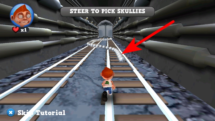 1、在游戏界面中,操控角色改变方向,收集路径上的骷髅道具来积累资源。
