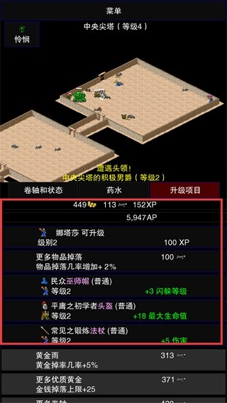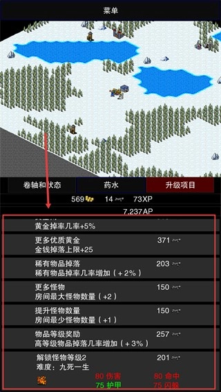 4、在世界地图探索时,升级【黄金掉率几率+5%】等项目,提升资源获取效率,助力地牢冒险。
