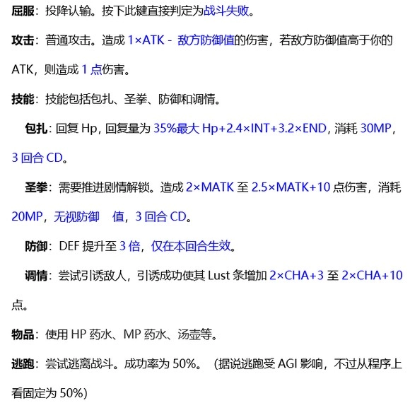 ②战胜:触发战胜类CG的条件为,需通过魅惑(flirt)让对方的lust值达到100,同时自身的lust值要处于40及以上。