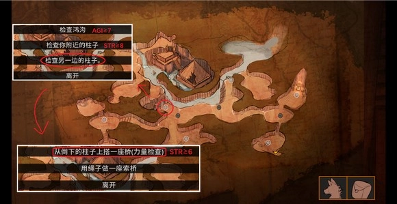 3)森林地下城,在鸿沟与柱子的位置选择“检查另一边的柱子”,若玩家身上携带至少一条绳子,就选择“利用倒下的柱子搭建一座桥”。