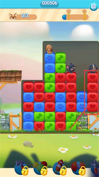 2、关卡内目标为收集【0/3-猫】,优先消除宠物下方的方块,助力宠物下落,聚焦该收集目标推进当前关卡进度。