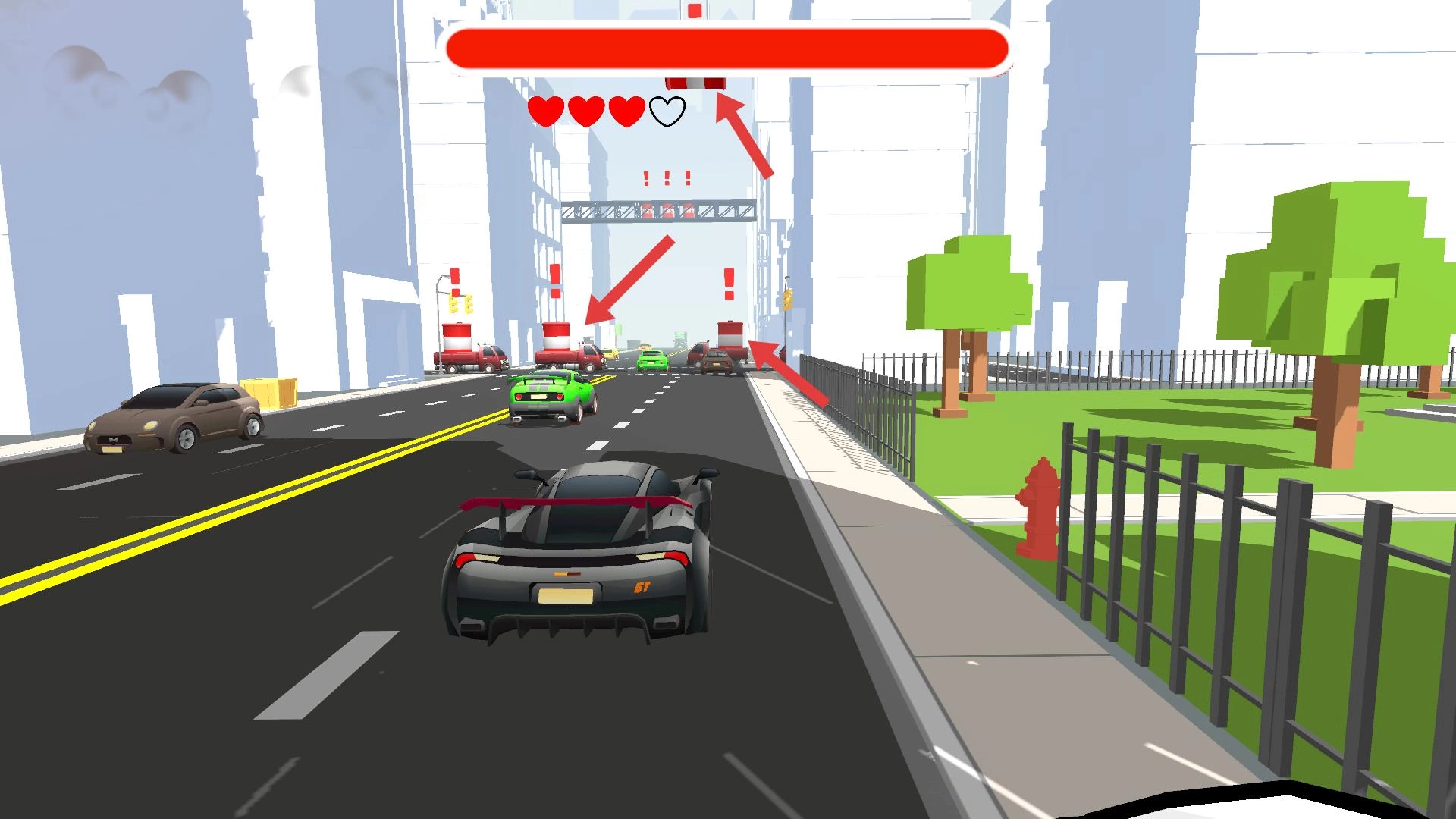 撞击车辆时,得留意前方带有感叹号标识的油桶车与直升飞机,一旦碰到它们,就会减少血量和心心。