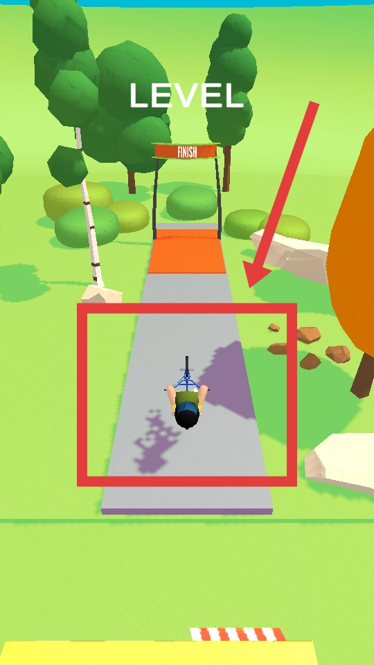 在骑行时操控角色避开跑道两侧的障碍物,确保自行车始终在跑道内行进,朝着标有FINISH的终点方向前进。
