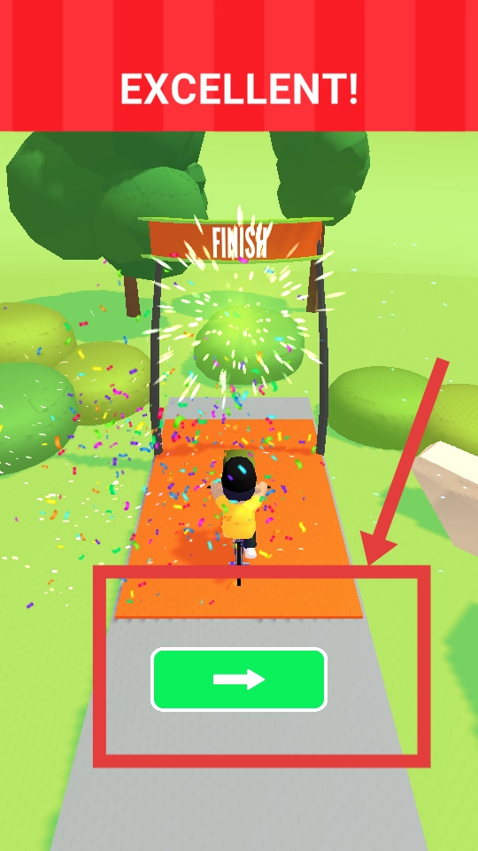 成功冲过终点FINISH后会出现庆祝画面,点击绿色箭头按钮,就能完成当前关卡并进入下一个自行车闯关关卡。