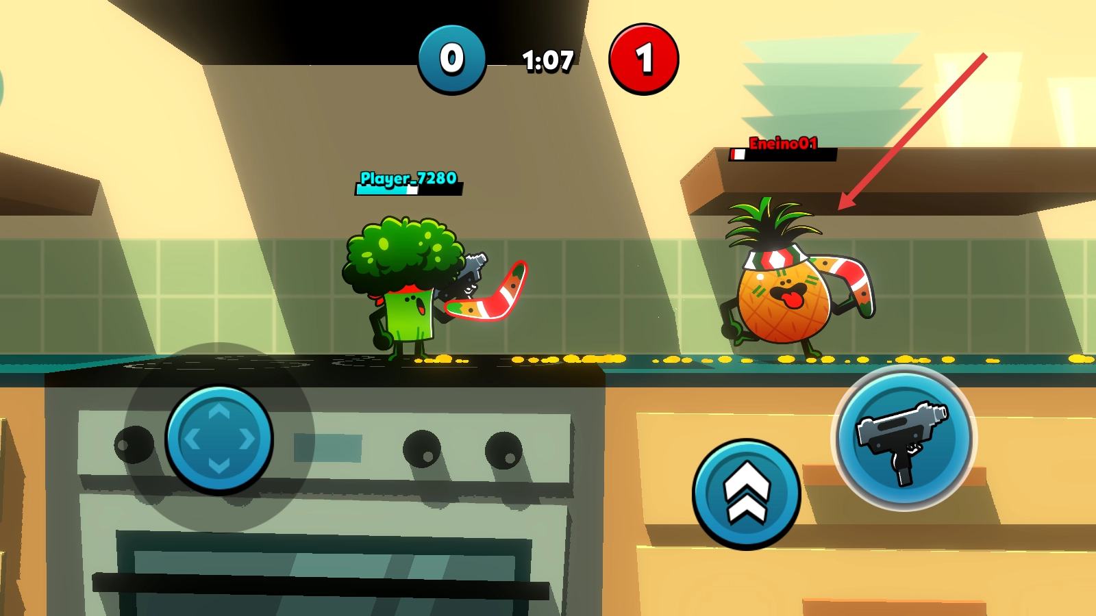 食物帮派是一款非常有趣的动作射击类游戏,卡通的任务形象非常的可爱,这是发生在厨房里的竞技,虚拟的摇杆操控,在游戏中玩家需要操控自己的水果蔬菜进行战斗,你的武器装备可能是枪也可能是斧头。