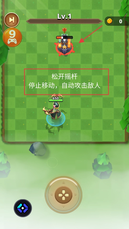 2、松开【摇杆】可让角色停止移动并【自动攻击】敌人,战斗时可先走位再松摇杆高效输出。