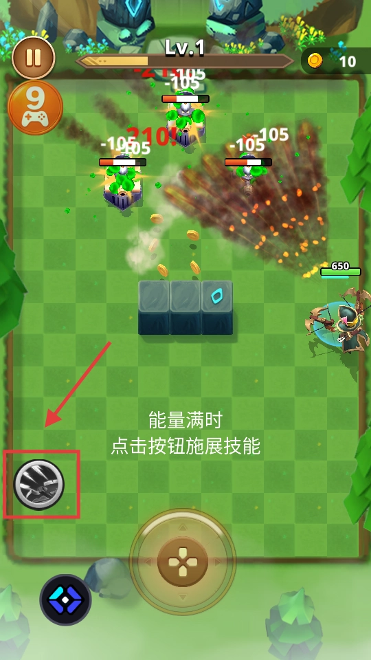 4、【能量】积满时,点击左下角【技能按钮】施展技能,可快速清怪或对敌人造成高额伤害。