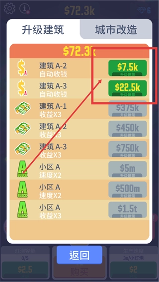 2、在升级界面优先选【建筑-A-2】,花【$7.5k】升级它的自动收钱功能,能快速积累资源,为后续升级铺路啦。
