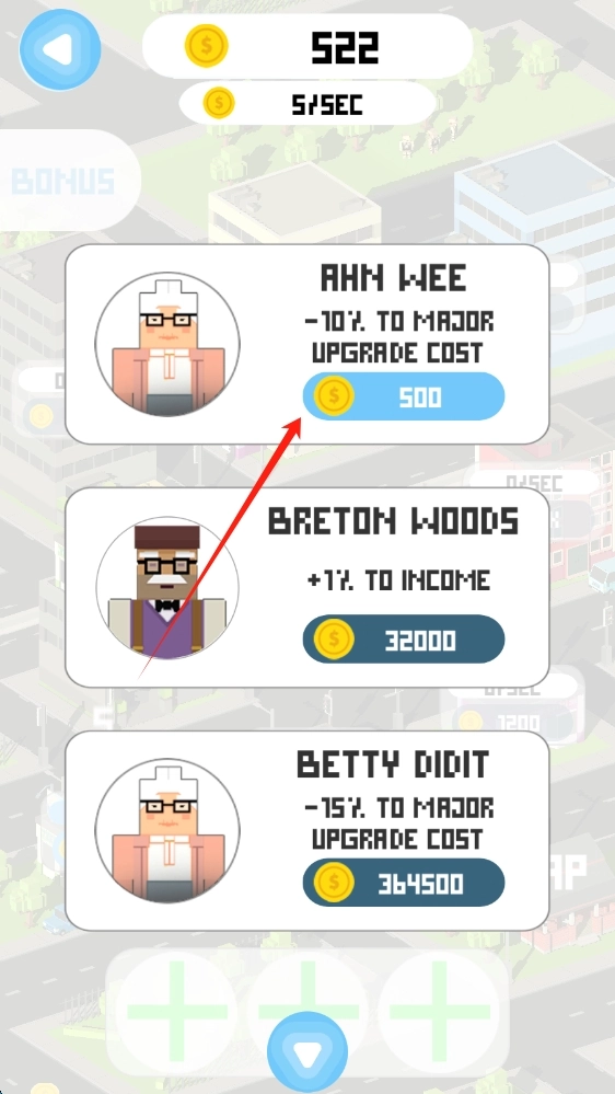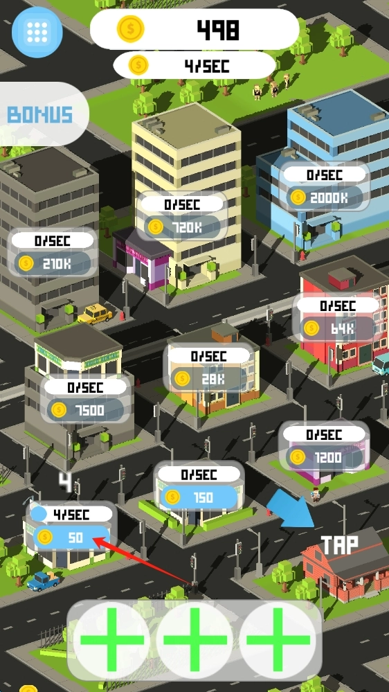 在城市界面里,建议优先升级那些低等级的建筑,像花费50金币就能升级的这类,这样能快速攒下初始金币,让每秒的收益得到提升。