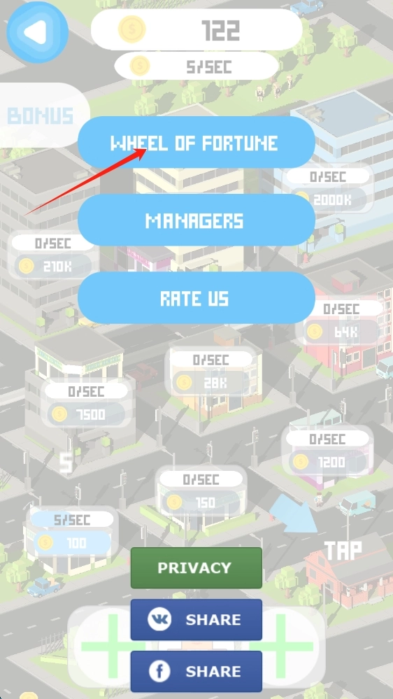 点击WHEEL OF FORTUNE,参与抽奖活动,有机会赢取额外金币或道具,为城市发展增添助力。