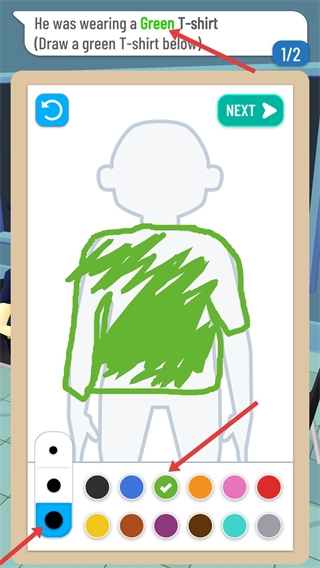 按照提示选择绿色,在人物的轮廓上绘制出绿色T恤,完成这一步后点击NEXT按钮,就能进入下一个绘画任务。