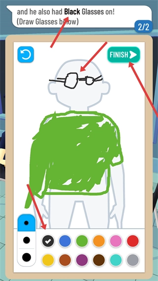 挑选黑色,在人物头部绘制黑色眼镜,完成绘制后点击FINISH,以此结束这一轮的绘画环节。