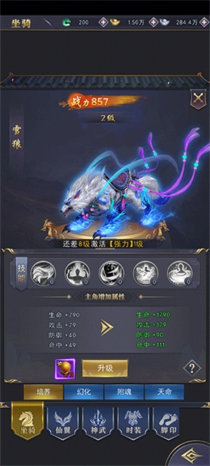 坐骑的强化玩法包含培养、进阶与修炼,效果相当出色。升级坐骑不仅能解锁强力技能,所需的核心材料坐骑培养丹可从材料副本或运营活动中获取。提升坐骑等级益处良多,既能增加玩家战力,还能激活坐骑技能为角色提供属性加成;此外还有幻化系统,玩家可通过参与各类运营活动或收集碎片合成,获得外观炫酷的坐骑。